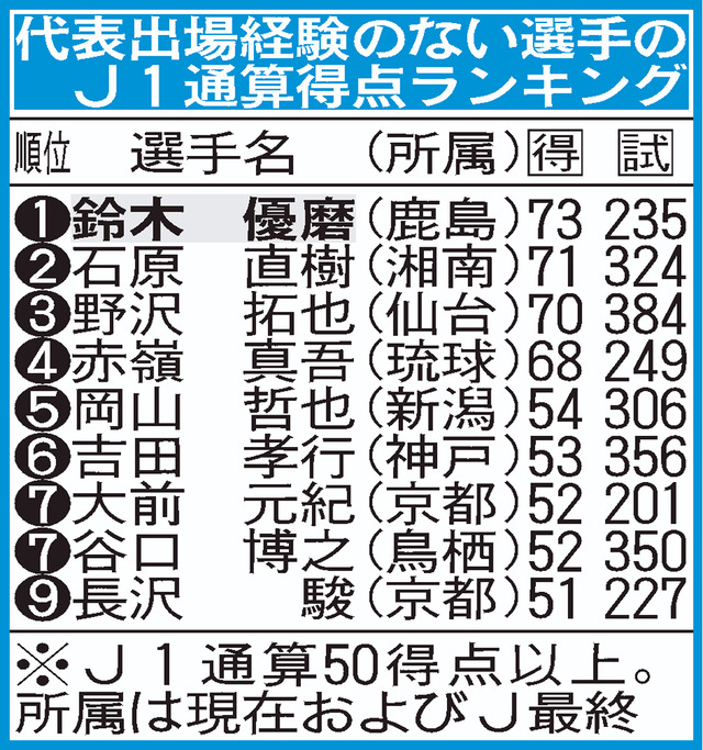 ◆Jリーグ◆代表出場経験ない選手のJ1通算得点ランキングが話題に!